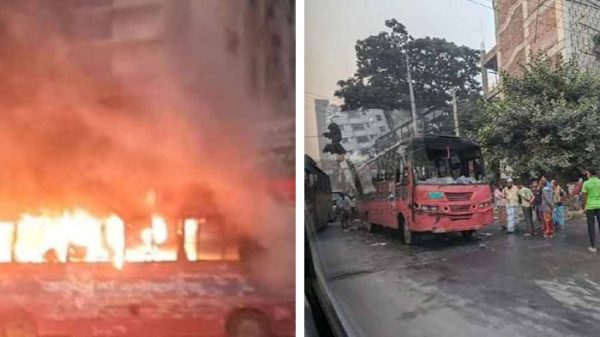 রাজধানীর মেরুল বাড্ডা ও শাহজাদপুর এলাকায় বাসে আগুন দেওয়ার ঘটনা ঘটেছে। সোমবার (১০ নভেম্বর) ভোরের দিকে এ ঘটনা ঘটে বলে জানিয়েছে ফায়ার সার্ভিস। পরে তাদের সদস্যরা ঘটনাস্থলে গিয়ে আগুন নেভান।