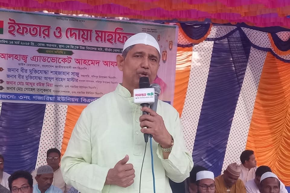 আতিকুল আলম স্টাফ রিপোর্টার টাঙ্গাইলের সখীপুর উপজেলার গজারিয়া ইউনিয়ন বিএনপির আয়োজনে ইফতার ও দোয়া মাহফিল অনুষ্ঠানে অংশ নিয়ে এসব কথা বলেন বিএনপির ভাইস চেয়ারম্যান এড আহমেদ আযম খান। শুক্রবার(১৩মার্চ)উপজেলার কে.জি.কে উচ্চ বিদ্যালয় মাঠে এ আয়োজন করা হয়।গজারিয়া ৩নং ইউনিয়ন বিএনপির আয়োজনে প্রায় ৪ সহস্রাধিক রোজাদারকে ইফতার মাহফিলে যোগ দেয়।এ ইফতার মাহফিলের প্রধান অতিথি হিসেবে উপস্থিত ছিলেন বিএনপির ভাইস চেয়ারম্যান এড আহমেদ আযম খান।তিনি প্রধান অতিথির বক্তৃতায় উপস্থিত মুসল্লীদের উদ্দেশ্যে বলেন,জুলাই আন্দোলনে ছাত্র-জনতার ঐতিহাসিক বিপ্লবে বিএনপির অগ্রণী ভূমিকার অবিস্মরণীয়। এদেশের মানুষকে আর বোকা বানানো যাবে না।