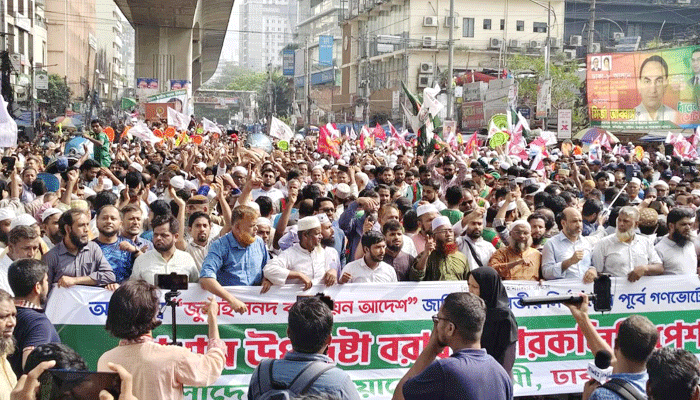 এর আগে সকাল সাড়ে দশটার দিকে মিছিলের নেতৃত্ব দেন জামায়াতের সেক্রেটারি জেনারেল মিয়া গোলাম পরওয়ার। তার নেতৃত্বে ঢাকা দক্ষিণের বিভিন্ন থানা ও ওয়ার্ড পর্যায়ের নেতা-কর্মীরা ব্যানার-ফেস্টুন নিয়ে মিছিলে অংশ নেন। পাঁচ দফা দাবির মধ্যে আরও রয়েছে অন্তর্র্বতী সরকারের মেয়াদে রাজনৈতিক হয়রানি ও গ্রেপ্তার বন্ধ, নির্বাচনে সব দলের সমান সুযোগ এবং ধর্মীয় স্বাধীনতা ও রাজনৈতিক সংগঠনের কার্যক্রমে বাধাহীনতা নিশ্চিত করা।