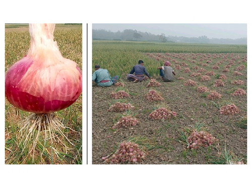 পাইকপাড়া গ্রামের কৃষক রবিউল ইসলামের বাড়িতে গিয়ে দেখা যায়, বাড়ির বাইরে মেয়েরা পেঁয়াজ থেকে গাছ কেটে আলাদা করছেন। বাড়ির মধ্যে ছড়িয়ে ছিটিয়ে রয়েছে পেঁয়াজ। ঘর-বারান্দা কোথাও একটু খালি জায়গা নেই। শোবার ঘরের খাটের নিচেও পেঁয়াজ। তিনি জানান, এবছর ৮ বিঘা জমিতে পেঁয়াজের চাষ করেছেন । এসব জমিতে হাইব্রীড লাল তীর কিং জাত রয়েছে। যার মধ্যে অর্ধেক জমির পেঁয়াজ বাড়িতে নিয়ে এসেছেন।