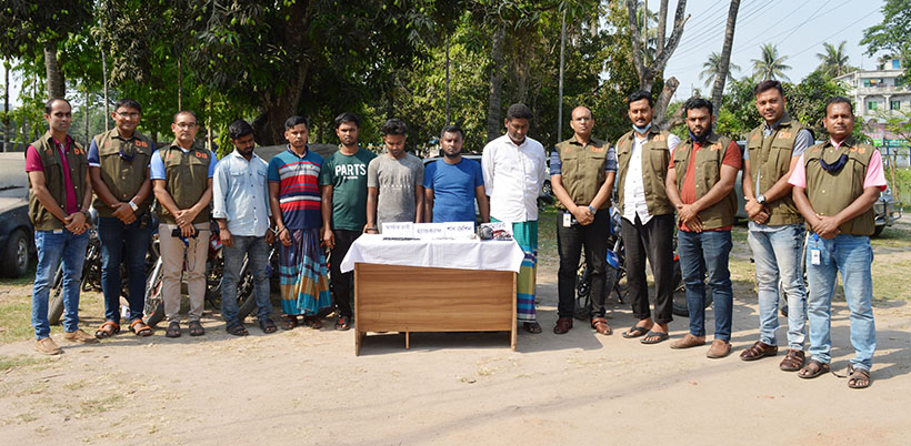 আটককৃতরা হলেন- সাতক্ষীরার কালীগঞ্জ উপজেলার শংকরপুর গ্রামের জব্বার আলীর ছেলে ইয়ার আলী (৩২), যশোরের শার্শা উপজেলার কাজীরবেড় এলাকার আমিন হোসেনের ছেলে তহিদুল ইসলাম (৩১), ঝিকরগাছা উপজেলার রঘুনাথপুর ডাঙ্গী গ্রামের সলেমানের ছেলে নাজমুল ইসলাম (২১), ফরিদপুর জেলা সদরের মৃগা দক্ষিণপাড়ার সিরাজুল ইসলামের ছেলে শরিফুল ইসলাম ওরফে সজল মোল্লা (২৭), কৃষ্ণনগর গ্রামের আবদুল খালেক খানের ছেলে জাকির হোসেন (৩১), বাহাদুরপুর গ্রামের আবদুল হাকিম মোল্লার ছেলে ইলিয়াস মোল্লা (৪০)।