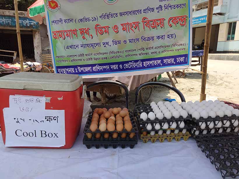 এ সময় সাধারণ মানুষের মধ্যে সামাজিক দূরত্ব বজায় রেখে ডিম,, দুধ ও মাংস বিতরণ করা হয়। প্রতি হালি ডিম ২৫ টাকা , দুধ লিটার ৬৫ টাকা এবং মুরগির মাংস ১৬০ টাকা বিক্রয় করা হয়।