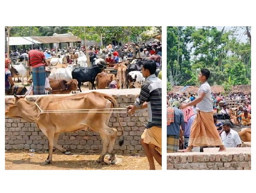 আসাদুর রহমান শার্শা প্রতিনিধি।। যশোরের শার্শার বাগআঁচড়া সাতমাইল পশুর হাটে গিজগিজ করছে পশু আর মানুষ। একজন আরেকজনের গা ঘেঁষে দাঁড়িয়ে আছে। কেউ দরদাম করছেন, কেউ পশু কিনে ট্রাকে তুলছেন। অধিকাংশ লোকের মুখে মাস্ক নেই, কারও কারও মাস্ক থাকলেও তা নামানো থুতনিতে। সামাজিক দূরত্বের নির্দেশনার তোয়াক্কা না করে ঝুঁকি নিয়ে পশু কেনাবেচা চলছে। শনিবার (৮ মে) দুপুরে বাগআঁচড়া পশু হাটে এ দৃশ্য দেখা গেছে।