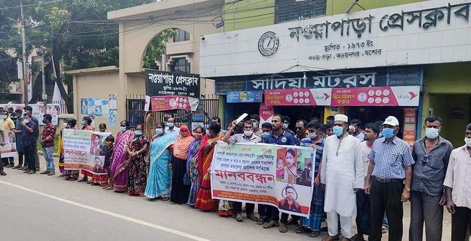 বক্তারা বলেন, মণিরামপুরের সুজাতপুর গ্রামের ননি গোপাল মন্ডলের ছেলে মশিয়াহাটি ডিগ্রি কলেজের প্রভাষক কনার মন্ডলের ভাড়া বাসার রান্নাঘর থেকে শনিবার রাতে স্ত্রী পিয়া মন্ডল ও একমাত্র কন্যা কথার ঝুলন্ত মরদেহ উদ্ধার করে পুলিশ। কনার মন্ডলের পরকীয়ার বিষয়টি স্ত্রী পিয়া জানতে পারায় তাকে ও তিন বছরের কন্যাকে পরিকল্পিতভাবে হত্যা করে। পরে হত্যাকান্ডকে আত্মহত্যা বলে প্রচার করতে মরদেহ দুটি রান্নাঘরে ঝুলিয়ে রাখে। ঘাতক কনার মন্ডলকে আইনের আওতায় এনে দৃষ্টান্তমূলক শাস্তির দাবি করেন বক্তারা।