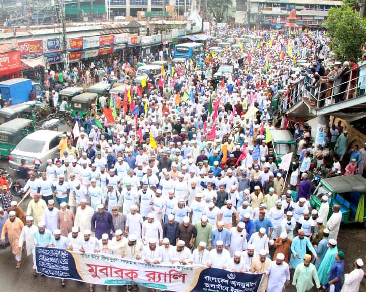 আজিজুল ইসলাম: পবিত্র ঈদে মীলাদুন্নবী (সা.) উপলক্ষে বাংলাদেশ আনজুমানে তালামীযে ইসলামিয়ার উদ্যোগে ১৯ অক্টোবর (মঙ্গলবার) আধ্যাত্মিক রাজধানী পুণ্যভূমি সিলেট নগরীতে হাজার হাজার মানুষের স্বতঃস্ফুর্ত অংশগ্রহণে অনুষ্ঠিত হয়েছে ‘মুবারক র্যালি’। সুন্নী ছাত্র কাফেলা বাংলাদেশ আনজুমানে তালামীযে ইসলামিয়ার উদ্যোগে অনুষ্ঠিত এ ‘মুবারক র্যালি’তে অংশগ্রহণের জন্য সকাল থেকেই সোবহানীঘাটস্থ হযরত শাহজালাল দারুচ্ছুন্নাহ ইয়াকুবিয়া কামিল মাদরাসা প্রাঙ্গণে সিলেট বিভাগের প্রত্যন্ত অঞ্চল থেকে সর্বস্তরের ছাত্র-জনতা জমায়েত হন। সকাল ১১টা থেকে যুহরের পূর্ব পর্যন্ত প্রিয়নবী (সা.) এর জীবনের বিভিন্ন দিক নিয়ে আলোচনা করেন বিভিন্ন স্তরের নেতা-কর্মী ও অতিথিবৃন্দ। বাদ যুহর শুরু হয় র্যালি। প্রিয়নবীর শানে রচিত কালজয়ী নানা কবিতার শ্লোক অঙ্কিত রঙ-বেরঙের ফেস্টুন ও প্লেকার্ড র্যালিতে শোভাবর্ধন করে। আশিকে রাসূল ছাত্রজনতার সুরে সুরে ধ্বনিত হয় প্রিয়নবীর প্রশংসাগীতি। সালাম সালাম নবী সালাম সালাম, মাওলা ইয়া সাল্লি ওয়া সাল্লিম, বালাগাল উলা-বি কামালিহি, শামছুদ্দুহা আস্সালাম, ... এ রকম অগণিত নাত-এর সুমধুর সুর লহরি নগরীর আকাশ বাতাস মুখরিত করে। র্যালিপূর্ব আলোচনা সভায় বক্তারা বলেছেন, মহানবী হযরত মুহাম্মদ (সা.) হলেন বিশ্ব শান্তির অগ্রদূত। তার সার্বজনীন শান্তির বার্তা দুনিয়ার দিকে দিকে ছড়িয়ে দিতে হবে। সমাজে সাম্য ও সম্প্রীতি প্রতিষ্ঠায় তাঁর আদর্শের কোনো বিকল্প নেই। প্রিয়নবী হযরত মুহাম্মদ (সা.) বিশ্বমানবতার এক ক্রান্তিলগ্নে দুনিয়ার বুকে তাশরীফ এনেছিলেন। তখন মানুষে মানুষে ছিল হানাহানি। চারিদিকে ছিল অসত্য আর অন্যায়ের জয়জয়কার। দুঃশাসনের যাতাকলে নিষ্পেষিত ছিল মানব সমাজ। এমনি সময়ে মানুষকে প্রকৃত মানবিক মর্যাদায় প্রতিষ্ঠিত করতে দুনিয়ার বুকে তাশরীফ এনেছিলেন মহানবী হযরত মুহাম্মদ (সা.)। তিনি ছিলেন বিশ্বমানবতার জন্য আল্লাহর সর্বশ্রেষ্ঠ করুণা ও অনুগ্রহ। তাঁর জীবনদর্শনে ব্যক্তি ও সমাজ জীবনের সর্বোত্তম ও পরিপূর্ণ আদর্শ নিহিত রয়েছে। সে আদর্শ অনুসরণে সমাজে শান্তি, সম্প্রীতি, সৌহার্দ্য, ভ্রাতৃত্ব প্রতিষ্ঠায় আমাদের এগিয়ে আসতে হবে। প্রিয়নবীর প্রতি যেমন সর্বোচ্চ ভালোবাসা লালন করতে হবে তেমনি তাঁর সুমহান আদর্শ অনুসরণ, চর্চা ও প্রচার-প্রসারে আমাদের অগ্রণী ভূমিকা পালন করতে হবে। বক্তারা বলেন, বর্তমান সময়ে কিছু কুচক্রীমহল দেশে অস্থিতিশীল পরিবেশ সৃষ্টির অপচেষ্টা করছে। মুসলমান ও হিন্দুদের মধ্যে সংঘাত সৃষ্টির পায়তারা করছে। এ বিষয়ে আমাদের সতর্ক থাকতে হবে। ইসলাম কখনো অশান্তি সৃষ্টি ও সংঘাতকে সমর্থন করে না। ইসলামের নবী দুনিয়াতে সাম্প্রদায়িক সম্প্রীত