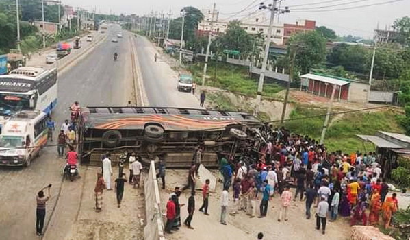 অপরদিক থেকে আসা ঢাকাগামী একটি প্রাইভেট কারকে ধাক্কা দিলে প্রাইভেট কারের সামনের অংশ দুমড়ে-মুচড়ে যায় এবং বাসটি উল্টে যায়। এতে দুইটি গাড়িচালকসহ বাসের প্রায় ১৫ জন যাত্রী আহত হয়। এসময় বাসটি সড়কের মাঝে উল্টে যাওয়ায় সড়কটিতে তীব্র যানজটের সৃষ্টি হয়। পরে ফায়ার সার্ভিস কর্তৃপক্ষ এসে বাসটি অপসারণ করে।