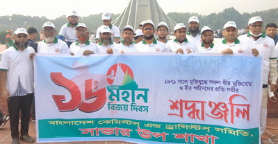 নিজস্ব প্রতিনিয়র সাভার।। জাতীয় স্মৃতিসৌধে ৫১তম মহান বিজয় দিবস উপলক্ষে বীর শহীদদের প্রতি শ্রদ্ধা জানিয়েছেন বাংলাদেশ কেমিস্ট এন্ড ড্রাগিস্ট সমিতি’র সাভার উপ-শাখা’রসভাপতি আলহাজ্ব মোঃ শামেল,সিনিয়র সহ-সভাপতি মোঃ আলী আব্বাস,সহ-সভাপতি মোঃ এখায়া আহমেদ।