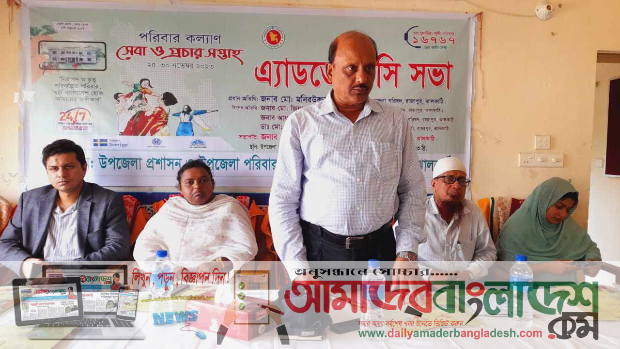 কঞ্জন কান্তি চক্রবর্তী, ঝালকাঠি জেলা প্রতিনিধিঃ ঝালকাঠির রাজাপুরে পরিবার কল্যাণ সেবা ও প্রচার সপ্তাহ সফল করার লক্ষ্যে এ্যাডভোকেসি সভা অনুষ্ঠিত হয়েছে। বুধবার বেলা সাড়ে ১১ টায় উপজেলা পরিবার পরিকল্পনা কার্যালয়ের হলরুমে উপজেলা প্রশাসন ও উপজেলা পরিবার পরিকল্পনা কার্যালয় কর্তৃক আয়োজিত এ অনুষ্ঠানে প্রধান অতিথি ছিলেন উপজেলা চেয়ারম্যান মোঃ মনিরুজ্জামান। ইউএনও ফারহানা ইয়াসমিনের সভাপতিত্বে বক্তব্য রাখেন পরিবার পরিকল্পনা কর্মকর্তা দেলোয়ার হোসেন, সাবেক মুক্তিযোদ্ধা কমান্ডার শাহ আলম নান্নু, উপজেলা বিআরডিবি অফিসার আব্দুস সালাম হাওলাদার, সাংবাদিক এনামুল হোসেন খান, রাজাপুর সাংবাদিক ক্লাবের সভাপতি রহিম রেজা, আরএমও ফারহান তানভীর, পরিবার পরিকল্পনা অফিসার ডা. কাজি দিলশাদ, পরিবার পরিকল্পনা পরিদর্শন বিপ্রদাস মাতব্বর, মাকসুদা বেগম প্রমুখ। এ অনুষ্ঠানে পরিবার পরিকল্পনা বিভাগেরসহ বিভিন্ন পর্যায়ের কর্মকর্তা ও স্বাস্থ্য সহকারিসহ সুধীজন উপস্থিত ছিলেন।
