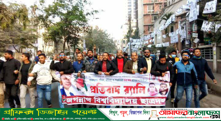 সোমবার (১লা জানুয়ারি) সকাল ৯টায় ক্যাম্পাস এলাকার জজকোর্ট সংলগ্ন জনসন রোডে জবি শাখা ছাত্রদলের সভাপতি আসাদুজ্জামান আসলাম ও সাধারণ সম্পাদক সুজন মোল্লার নেতৃত্বে এ প্রতিবাদ র্যালিটি করা হয়।
