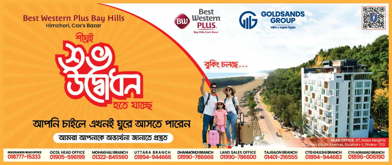 বেস্ট ওয়েস্টার্ন প্লাস বে হিলস্ বিশ্বের যে কোনো আন্তর্জাতিক মানের নান্দনিক হোটেলের চেয়েও সেরা। এখন পুরোদমে ট্রায়াল ও বুকিং চলছে। উদ্বোধনের আগেই একবার ঘুরে আসুন, দেখে আসুন নিজের চোখে। আমেরিকান চেইন বেস্ট ওয়েস্টার্ন প্লাস বে হিলস্-এ প্রকৃতির সাথে অবকাশ যাপনের আনন্দ উপভোগ করুন। গোল্ডস্যান্ডস গ্রুপ কর্পোরেট হেড অফিস : নাসা হাইটস, গুলশান-১, ঢাকা ফোন : ০১৮৭৭ ৭১৫৩৩৩