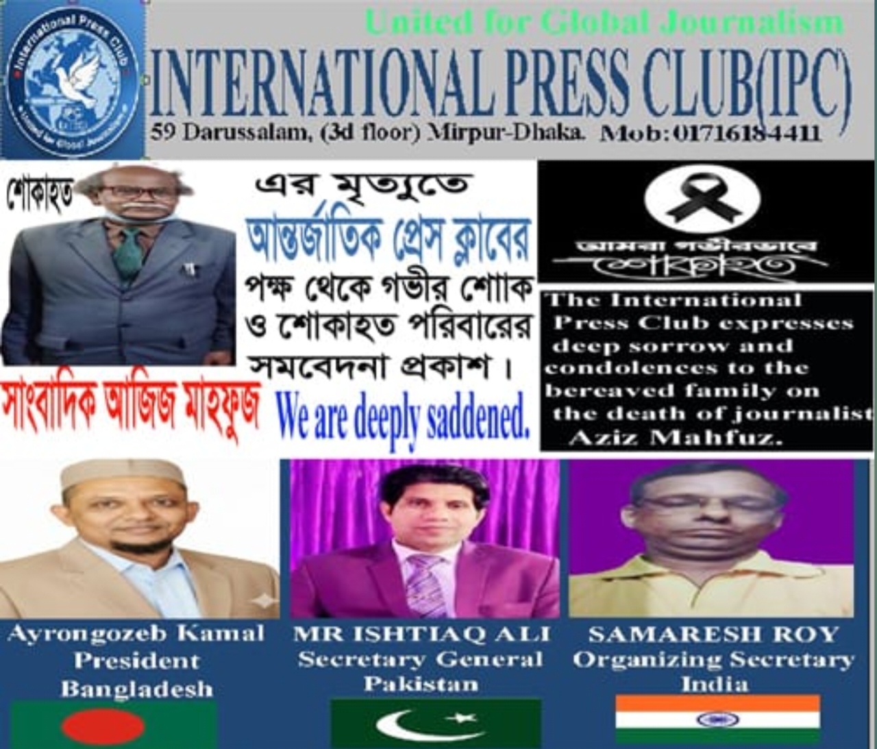 এছাড়া শোক প্রকাশ করেছেন আন্তর্জাতিক প্রেসক্লাব ও সংগঠনিক সম্পাদক সমরেশ রায় (ভারত),দপ্তর সম্পাদক আলহাজ্ব মোঃ সোহাগ (সৌদি আরব),মহিলা বিষয়ক সম্পাদক শম্পা দাশ (ভারত), রিনজিন ওয়াংচুক ও শেরিং দর্জি (ভুটান), এন. বিথ্যাথরন ও মঙ্গলনাথ লিয়ানারাচ্চি (শ্রীলঙ্কা), রামাবহাদুর রাওয়াল ও কাশীন্দ্র শর্মা (নেপাল), কিয়াও সোয়ে ও কিয়াও মিও মিন (বার্মা),শরণজিৎ সিং,আহমেদ জৈনি কামারুজ্জামান (মালয়েশিয়া), মোহাম্মদ ফাহাদ আল-হারথি (সৌদি আরব),আন্দ্রে রিখটার, ক্রিস্টফ প্লেট,সোহেল সরকার (যুক্তরাজ্য), দিলীপ রায় (কলকাতা) এবং শেখ মোস্তাফিজুর রহমান (বাংলাদেশ)।