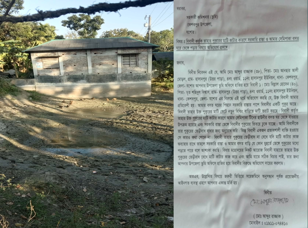 নিজস্ব প্রতিবেদক।। যশোরের কেশবপুর উপজেলার ১১নং হাসানপুর ইউনিয়নে অপরিকল্পিতভাবে পুকুরের মাটি কাটার ফলে একটি সরকারি রাস্তা ও এক ব্যক্তির বসতবাড়ি ধসে পড়ার উপক্রম হয়েছে। ভুক্তভোগী মোঃ আব্দুর রাজ্জাক প্রতিকার চেয়ে উপজেলা সহকারী কমিশনার (ভূমি) বরাবর একটি লিখিত অভিযোগ দায়ের করেছেন।